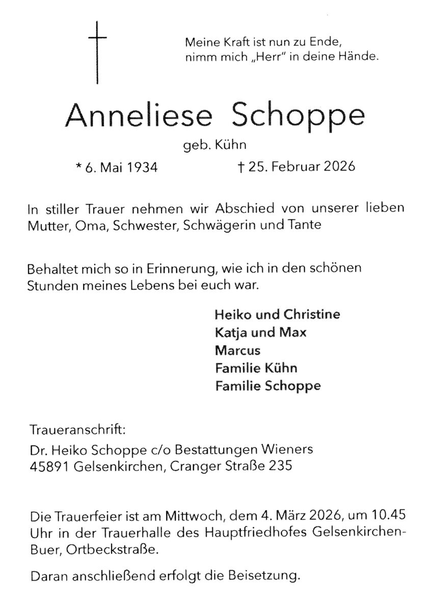 Die Trauerfeier ist am Mittwoch, dem 4. März 2026, in der Trauerhalle des Hauptfriedhofes Gelsenkirchen-Buer, Ortbeckstraße. Daran anschließend erfolgt die Beisetzung.