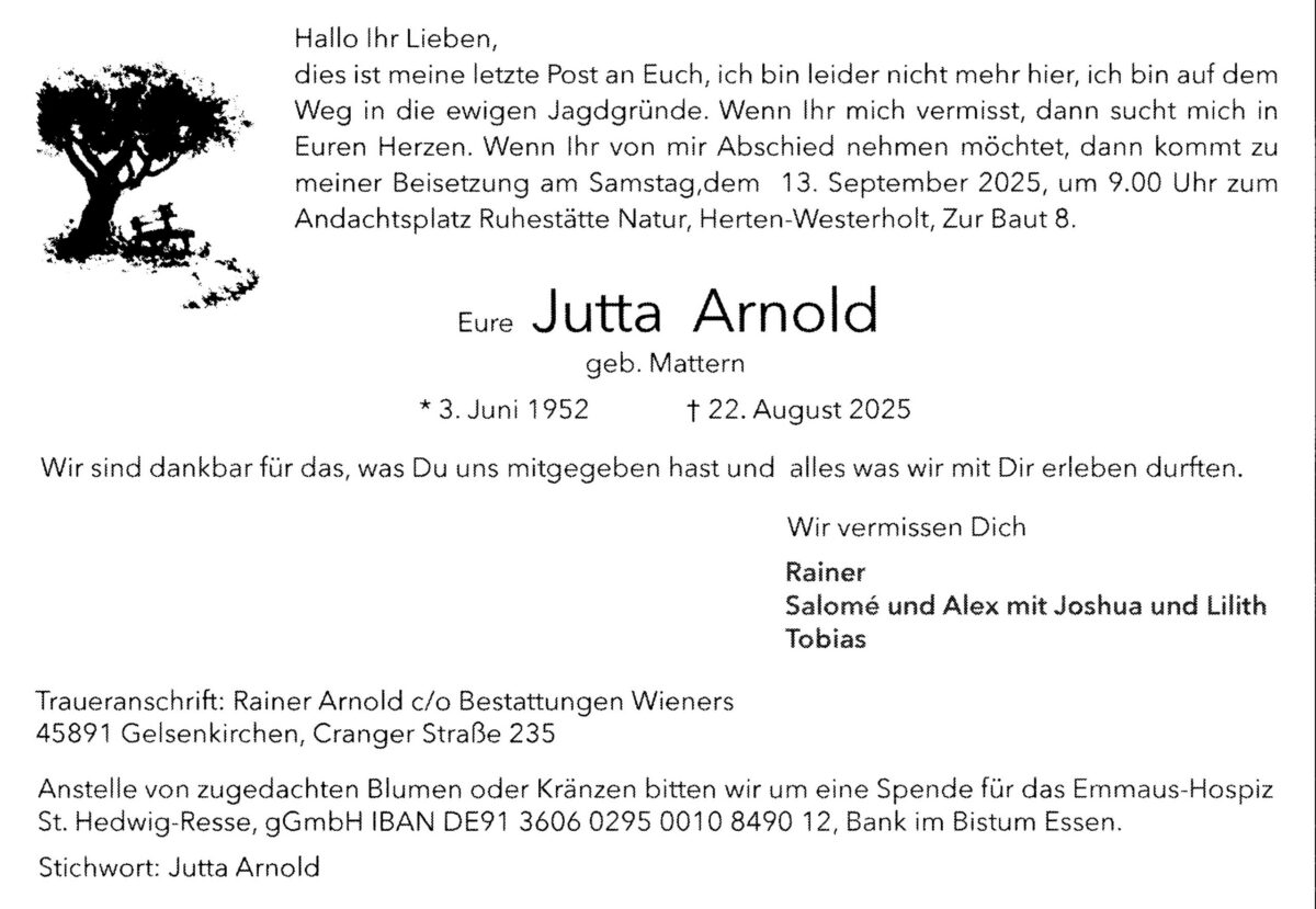 Die Trauerfeier ist am Samstag, dem 13. September 2025, um 9.00 Uhr am Andachtsplatz der Ruhestätte Natur, Herten Westerholt, Zur Baut 8. Daran anschließend erfolgt die Urnenbeisetzung.