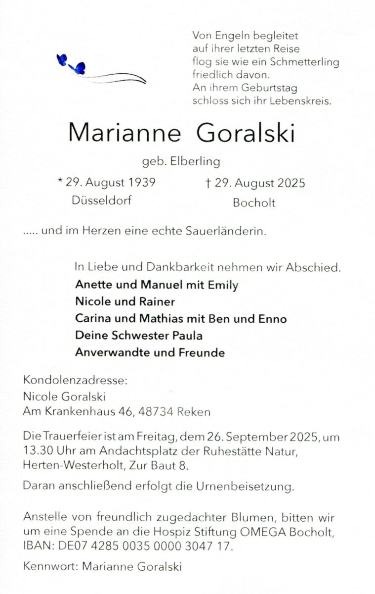 Die Trauerfeier ist am Freitag, dem 26. September 2025, am Andachtsplatz der Ruhestätte Natur, Herten-Westerholt, Zur Baut 8. Daran anschließend erfolgt die Urnenbeisetzung.