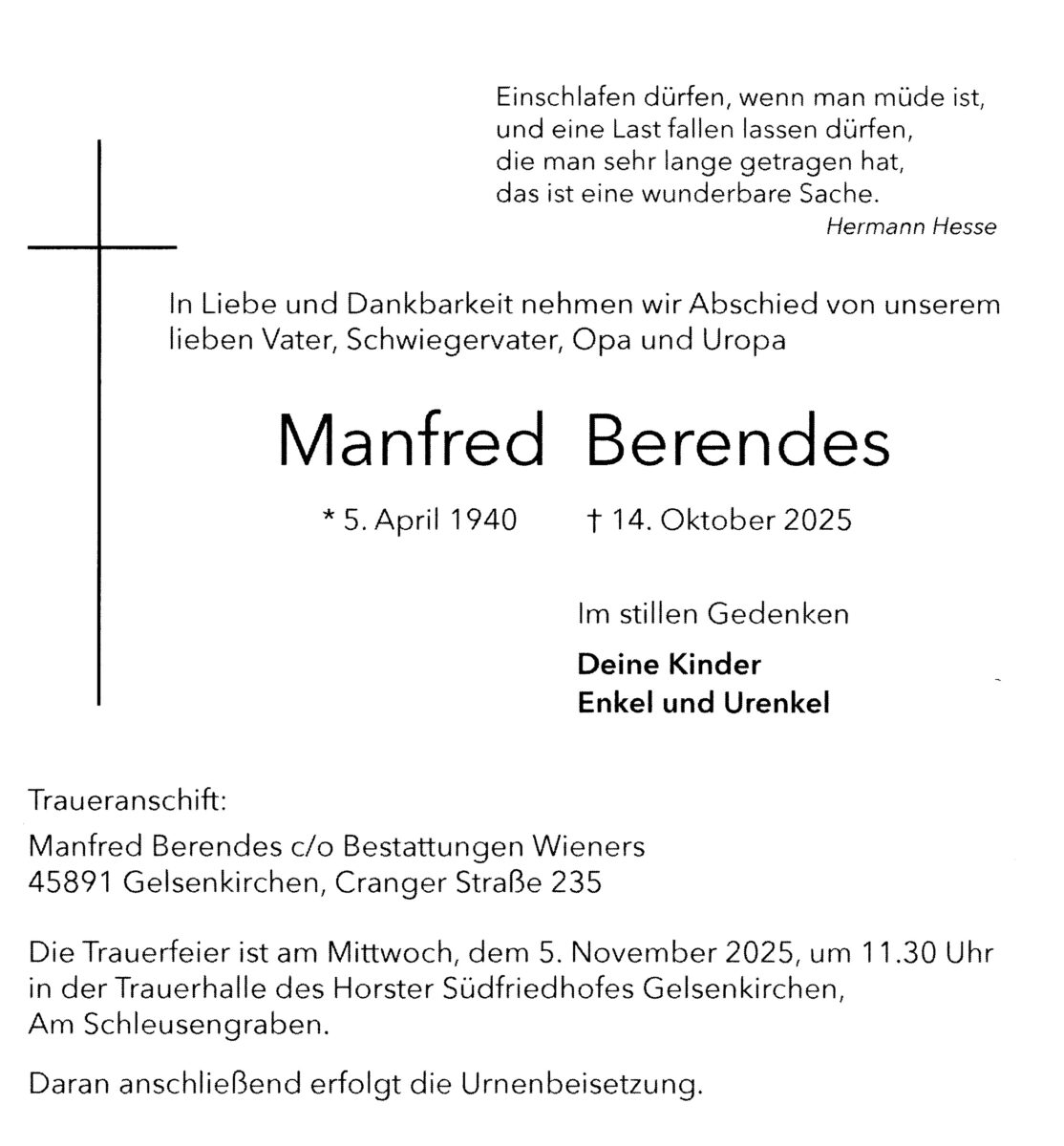 Die Trauerfeier ist am Mittwoch, dem 5 November 2025, in der Trauerhalle des Horster Südfriedhofes Gelsenkirchen, Am Schleusengraben. Daran anschließend erfolgt die Urnenbeisetzung.