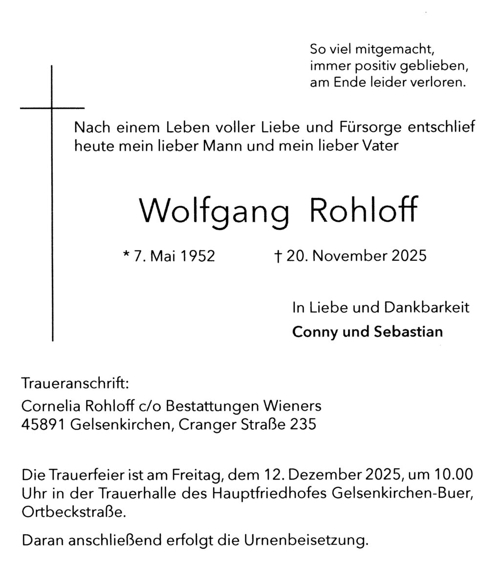 Die Trauerfeier ist am Freitag, dem 12. Dezember 2025, in der Trauerhalle des Hauptfriedhofes Gelsenkirchen-Buer, Ortbeckstraße. Daran anschließend erfolgt die Urnenbeisetzung.